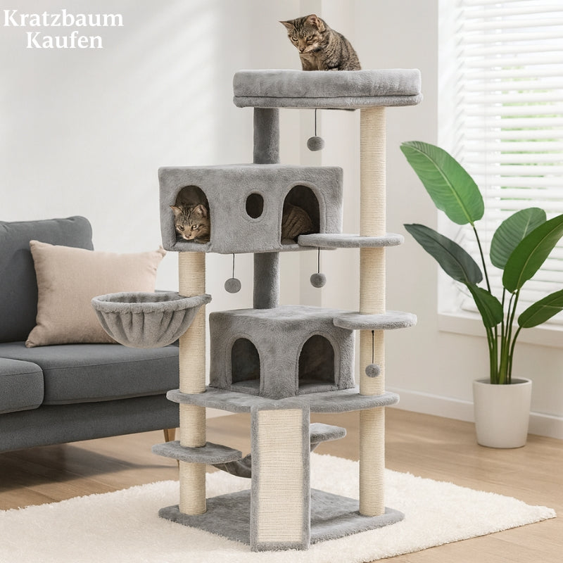 Material : Grauer Plüsch und natürliches Sisal | Abmessungen : 143cm Höhe | Farbe : Grau | Zubehör : Plattformen, Hütten, Hängematte und Spielzeug inklusive