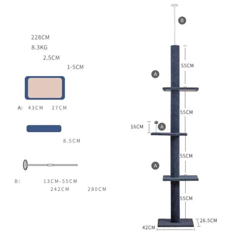 Verwandle den Lebensraum deiner Katze mit dem "SkyTower" Kratzbaum, einem wahren vertikalen Paradies, das deinem vierbeinigen Freund einen Ort zum Spielen, Ausruhen und Erkunden bietet. Speziell für aktive Katzen und Maine Coons konzipiert, erfüllt dieser von Boden bis Decke verstellbare Kratzbaum alle ihre Bedürfnisse.
