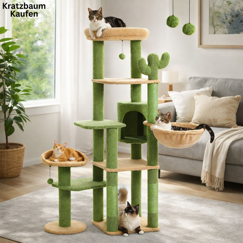 Entdecke das "CactusPalace", den geräumigen und spielerischen Katzenbaum, der alle Bedürfnisse deiner Katze erfüllt. Mit seinen mehreren Plattformen, seinem gemütlichen Kondominium, seiner kuscheligen Hängematte und seinem Kaktus-Design ist dieser XL-Katzenbaum ein wahres Paradies für deinen vierbeinigen Begleiter.