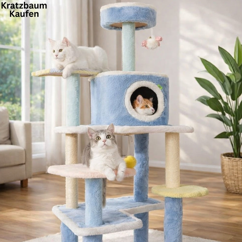 Einen blauen Katzenbaum - Kat-astrophisch mit mehreren Ebenen, einem geräumigen Versteck, natürlichen Sisal-Kratzpfosten, hängenden Spielzeugen und bequemen Plattformen für das Glück deiner Katze.