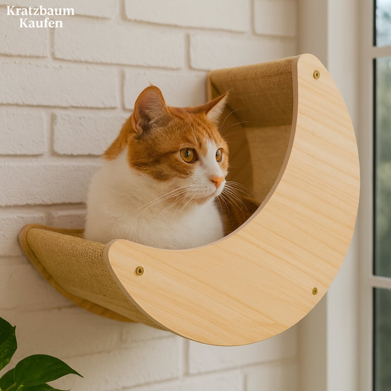 Einen Katzenbaum mit einer Hängematte in Mondform, Wandplattformen und allem Notwendigen für eine einfache Installation.