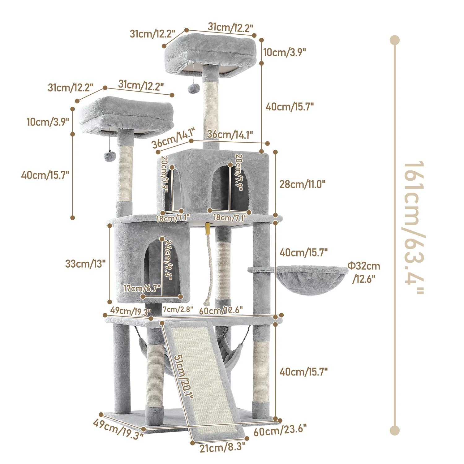 Luxuriöses Design in Plüsch | Hochwertige Materialien | Ideale Maße für große Katzen | Mehrere Ebenen zum Spielen und Ausruhen | Geräumige Kondos | Bequeme Liegeplätze | Sisalkratzfläche | Interaktives Spielzeug inbegriffen.