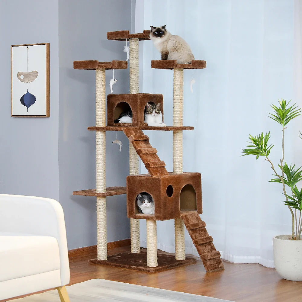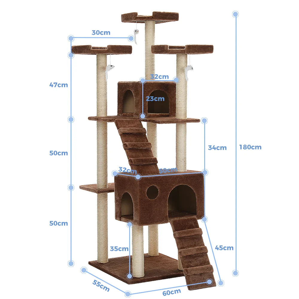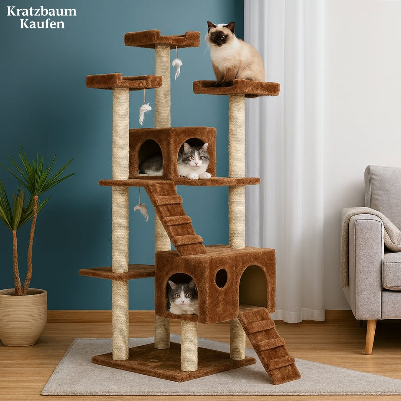 Struktur aus Holz, überzogen mit weichem Plüsch, 180 cm Höhe, ideal für große Katzen, geräumige Kondos, bequeme Liegeplätze, praktische Leitern, hängende Spielzeuge und Sisalpfosten zum Kratzen.