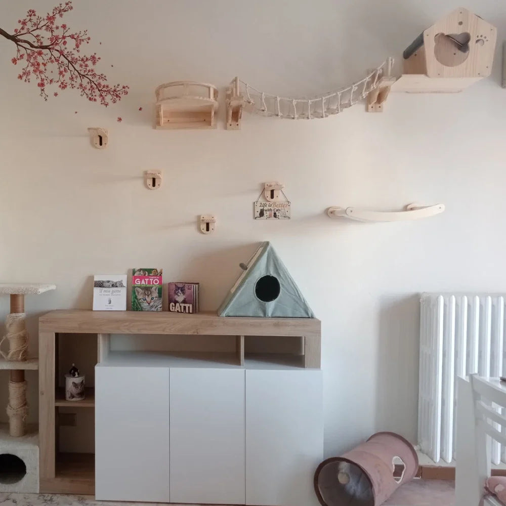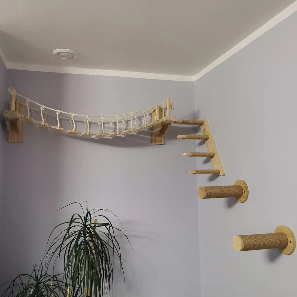 Der AcroChat Wand-Katzenbaum enthält eine hängende Brücke aus natürlichem Holz und eine clever integrierte Wand-Schale, die deiner Katze einen personalisierten Spiel- und Ruhebereich bietet.